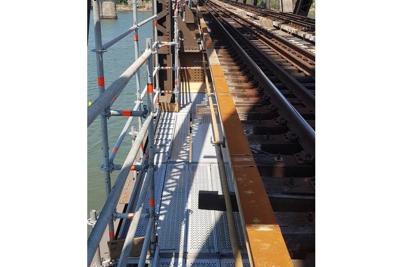 - Integrated scaffold platforms bearing to existing bridge steel members. Fall protection for workers on rail.