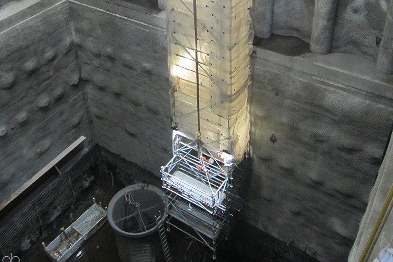 - 85m high stair tower suspended from cantilevered steel beams at the top of the shaft