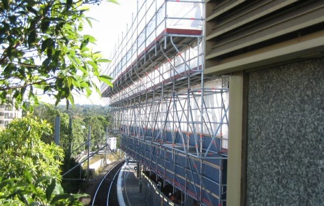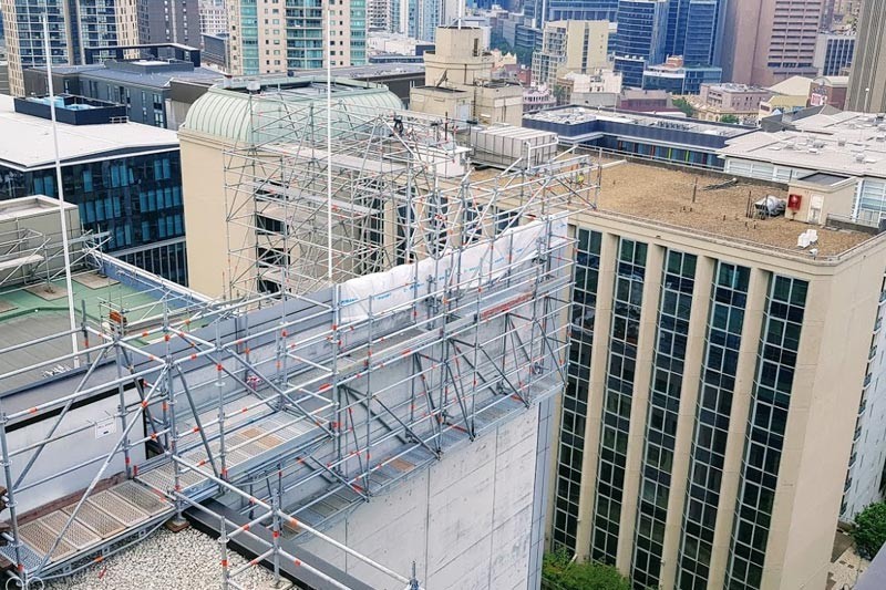 - External sawtooth shaped façade scaffold projecting up 24m in height and spanning the full length of the feature façade (~100m) Inclusive of shrink-wrapped roof for complete containment during replacement of cladding