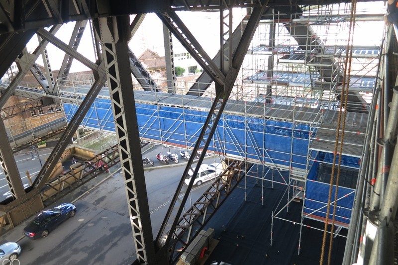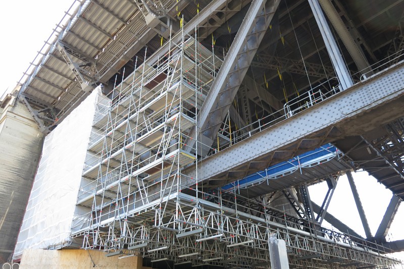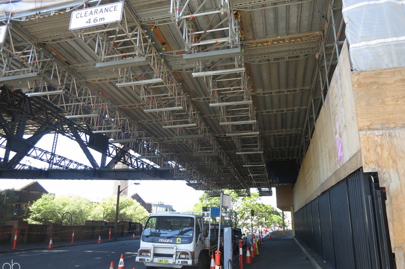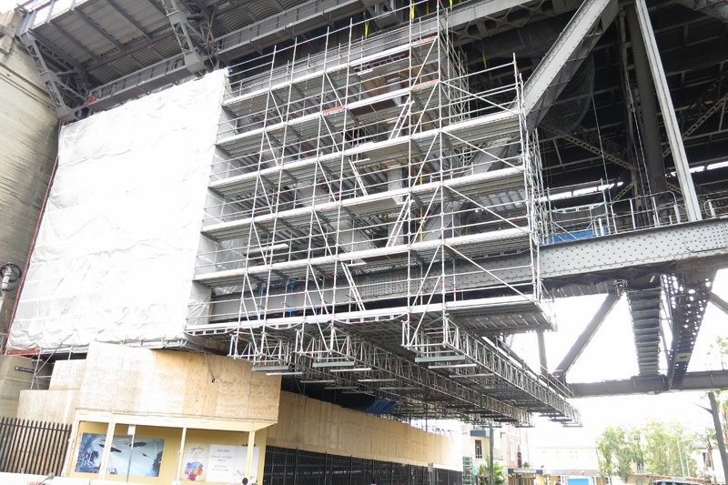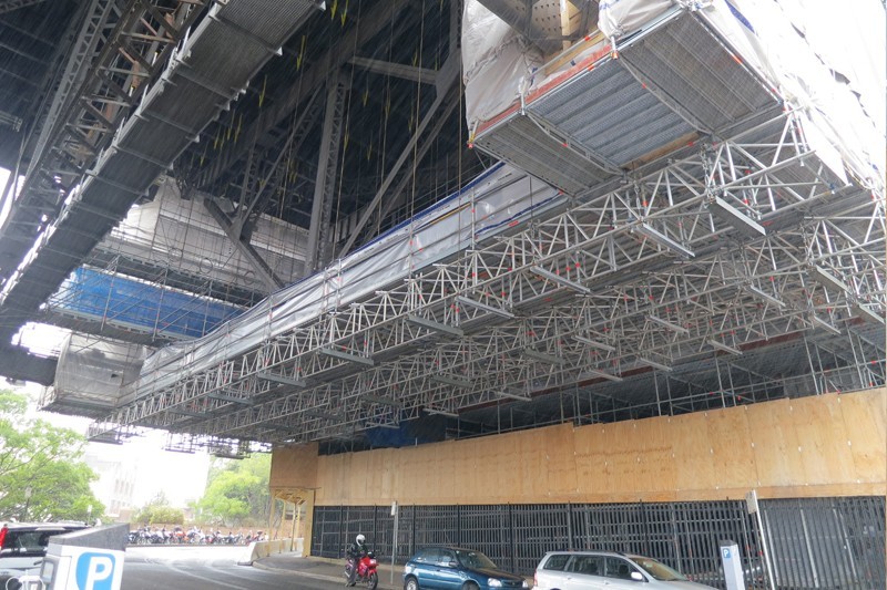 Design and install a suspended scaffold installation to the underside of the Sydney Harbour Bridge southern approach, over Cumberland Street, to facilitate grit blasting and painting of the bridge trusses and cross frames while maintaining unrestricted pedestrian and vehicle access, and without disruption to BridgeClimb operations.