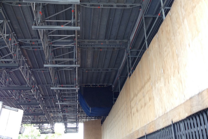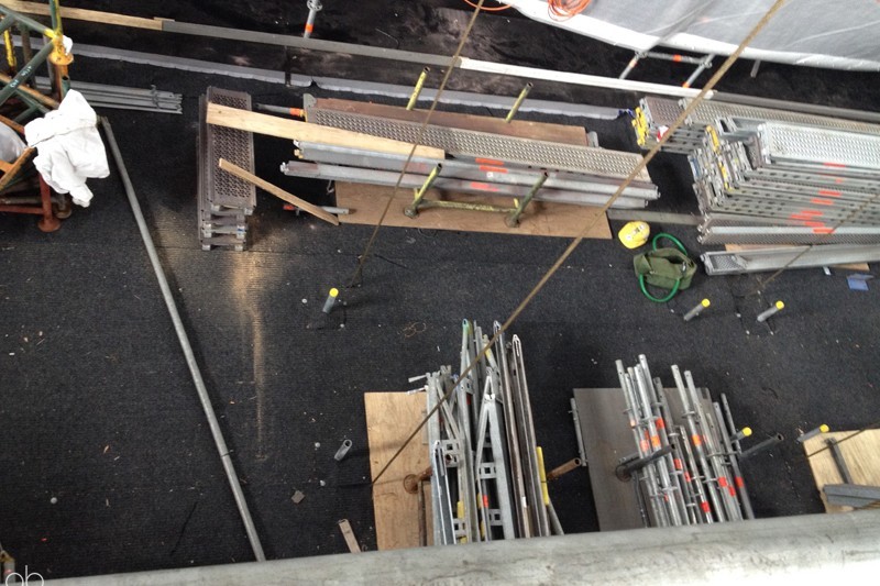 - 30m long aluminium trusses delivered as pre-assembled modules and hoisted into position.