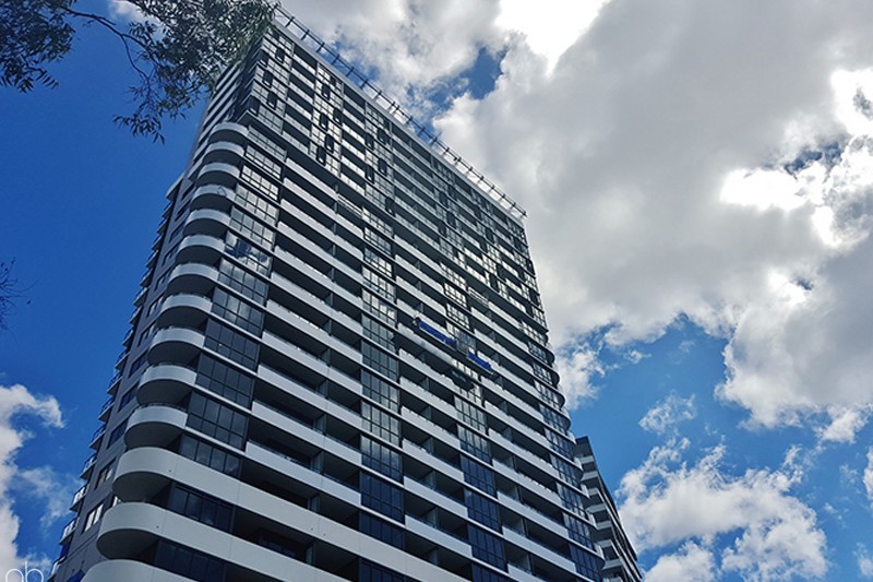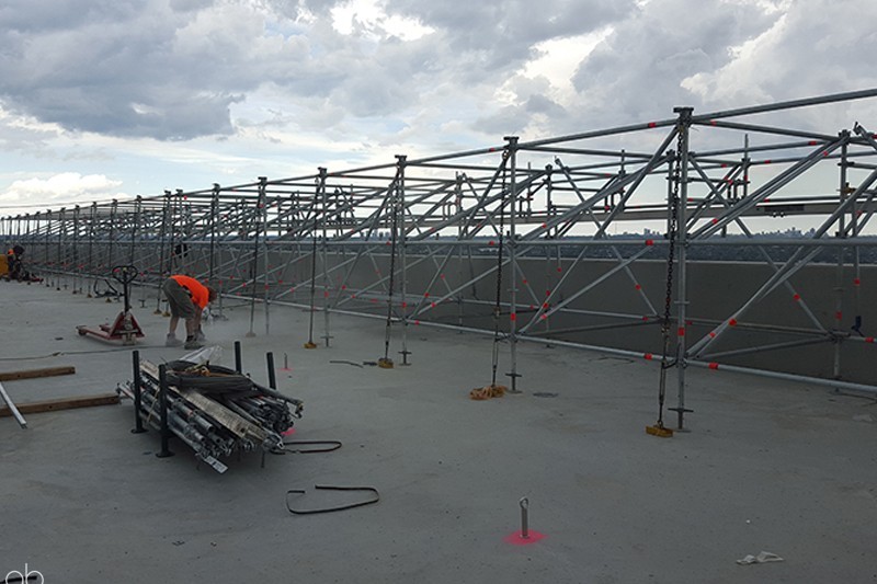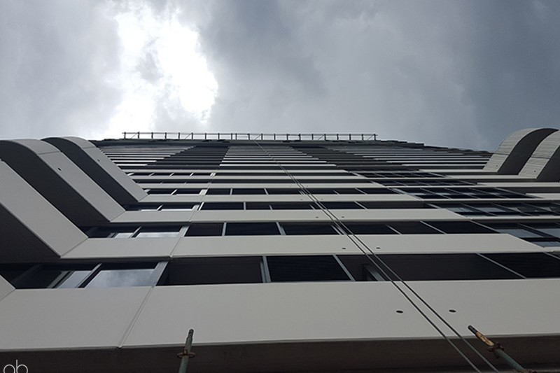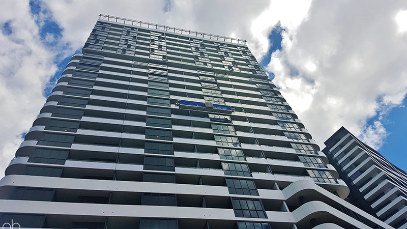 Design and install a monorail and swinging stage installation to provide rapid access over the full extent of the residential tower façade for installation of architectural window framing. System to permit the stage to operate above the projecting balconies and avoid wire ropes contacting the finished facade.