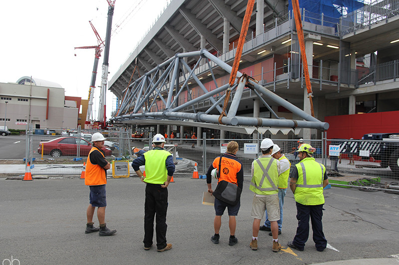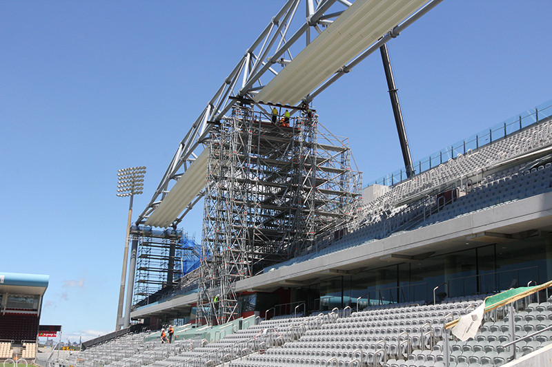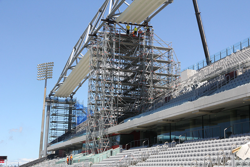 Design and install a propping tower installation to support the 100 Tonne stadium roof truss during removal and replacement. Ensure that the propping scaffold is also designed to resist horizontal forces imposed on the roof structure from 1 in 100 year wind loading.